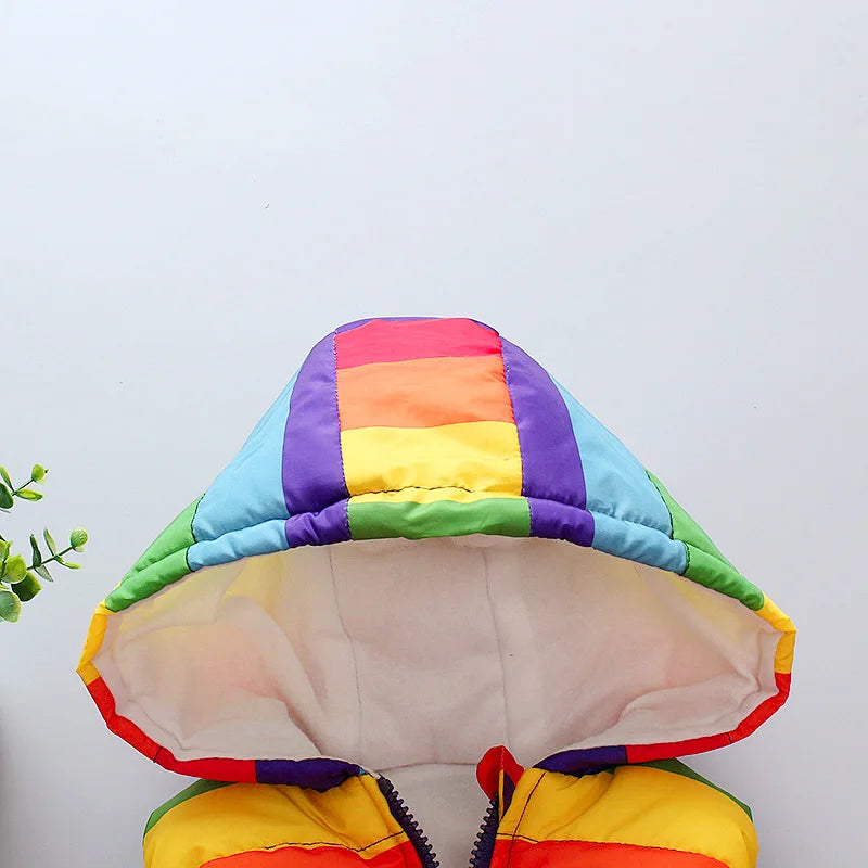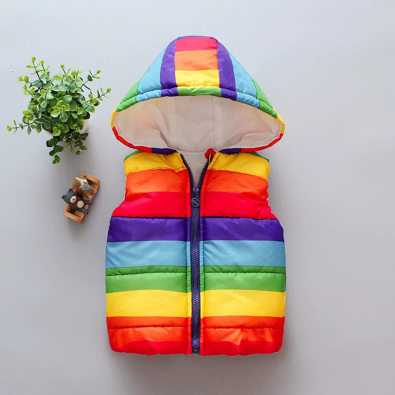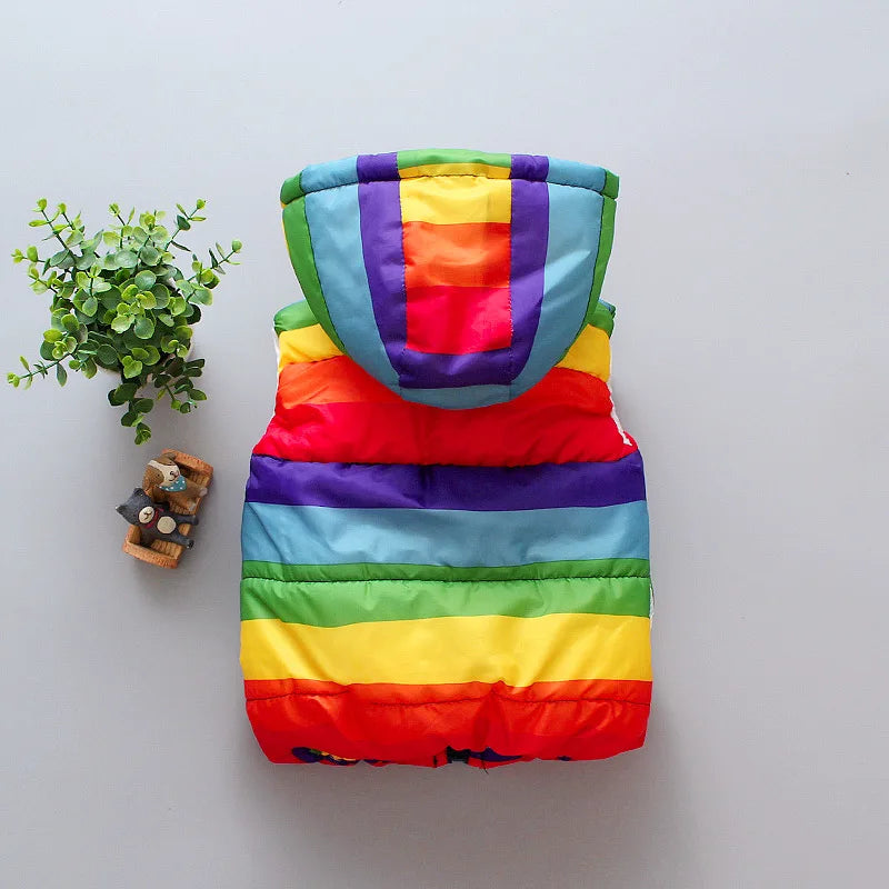 Color-pop stripes meet snuggly warmth in this thickened, windproof hooded vest. It’s the perfect layer for chilly school runs, playground play, and stroller strolls—warm without the bulk, and easy to toss over tees, sweaters, or pajamas.